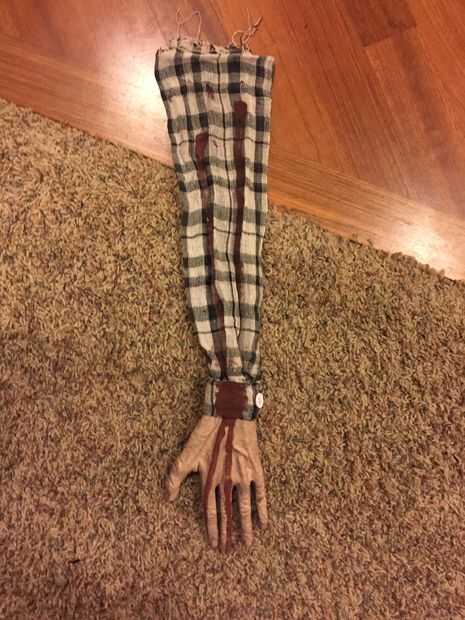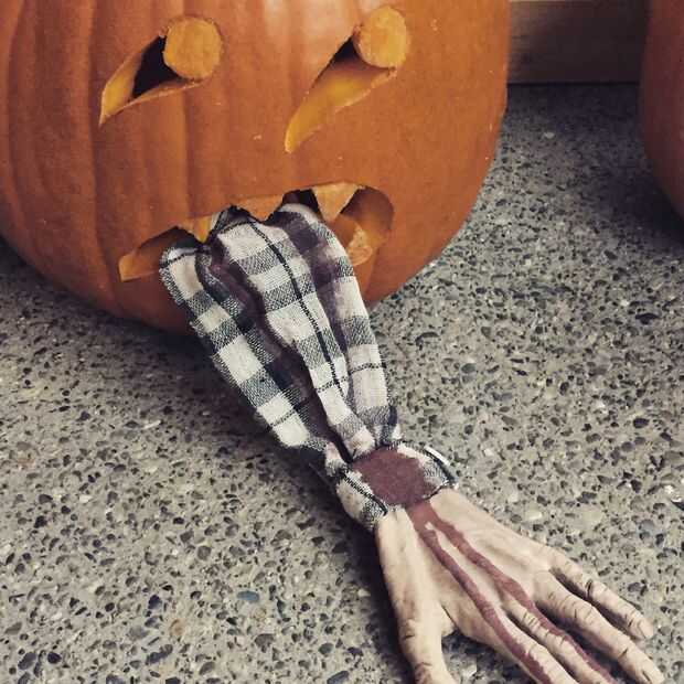 me salió a mi tienda local "espíritu Halloween" y comprar uno de estos por un precio razonable. Lo único que importa es que el extremo del brazo donde consiguió "tajado apagado", o el extremo opuesto de la mano, debe tener al menos 3" de la suave tela de la manga sin nada en él. Esto es así el brazo puede ser tirado a través de la boca de la calabaza y quedarse allí. (Perdón que expliqué mal. Mira la foto de la final para ver lo que me refiero.) ahora simplemente empuje tanto de la manga en la boca de la calabaza sobre una pulgada y cuando usted consigue un poco de la manga en la calabaza, de la parte superior de la calabaza y tire el resto de los 3-4" de la manga a través de. TENGA CUIDADO DE NO ROMPER NINGUNO DE LOS DIENTES! VAIVÉN CON CUIDADO Y SUAVEMENTE!