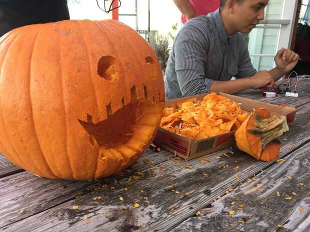 LA IDEA DEUna calabaza que se ilumina, se sacude y grita... [video]Es Halloween, naturalmente tenemos que tener un proyecto.La idea es tener una calabaza, que detecta la presencia de una persona intentando llegar a los dulces y luego emplea varios ef