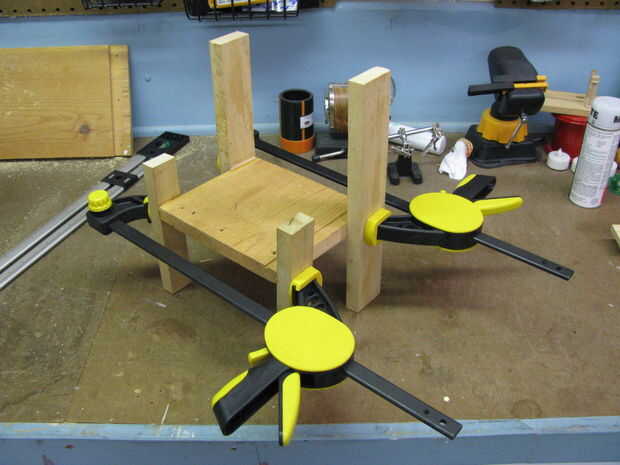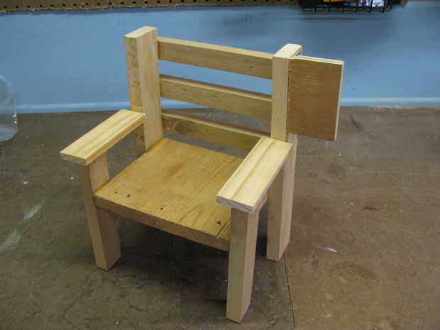 Las piernas fueron atadas a los lados del asiento usando pegamento de madera. Lo mismo para los soportes de espalda y brazo. Otro pedazo de madera fue unido al lado de la silla con soportes en L. El interruptor de cuchillo de entonces fue unido.