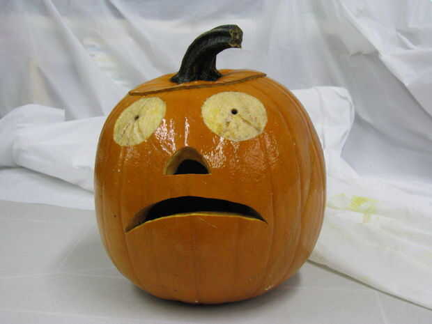 Tallar la calabaza de la manera habitual.  Para tallar los ojos, remonta 2 círculos con una taza de espresso.  Usé una dremel para quitar la cáscara exterior de la calabaza.  Se utiliza un taladro de 7/32" para el centro de los ojos.