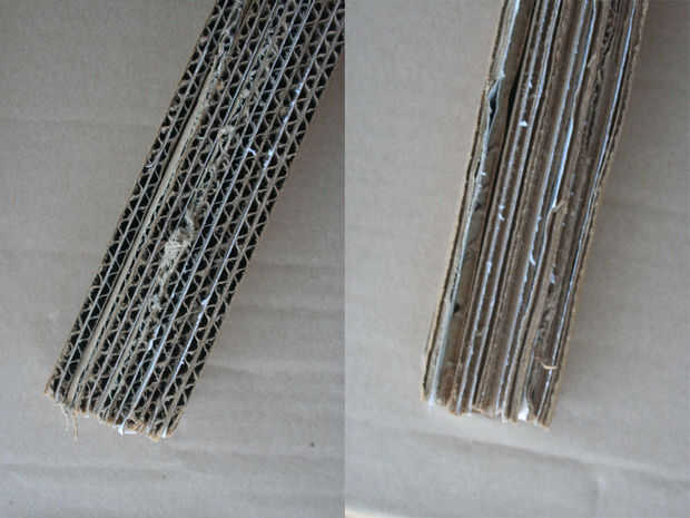 Punta: Cuando cortamos los pedazos rectangulares nos corte los bordes para que alinea con el patrón de la corrugación del cartón. Cuando usted corta una pieza rectangular te darás cuenta que los dos lados adyacentes tienen un aspecto distinto visto desde el lado. Un lado revela el patrón de zig-zag. El otro lado, el lado no-zigzag, se parecen más a dos hojas de papel con un pequeño espacio entre. Recomiendo cortar su dimensión 20 por lo que es la parte no zig-zag. Esto hará que el borde que la gente ve los patrones zigzag de la demostración. Se ve limpia y quizás estéticamente se ve más fuerte que el patrón de zigzag no.
