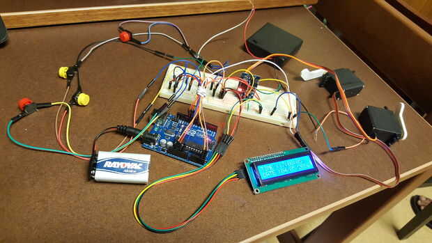 Los servos se pegan fuertemente en el interior de la cáscara del impreso, con los brazos impresos roscados en los extremos de manera que la abrazadera en la botella de agua en el medio. Los botones se colocan dentro de los agujeros de botón de la caja negra y los soportes de botón se pegan detrás de los botones para presionar fácilmente. La pantalla LCD se atornilla en el lado con el agujero más grande en el lado de la caja negra. La tapa en el sitio del curso recibe dos orificios para conectar los servos a través de la tapa a la arduino contenida en la caja negra. La cáscara se pega sobre la tapa de la caja negra para que permanezca inmóvil. Asas también se colocan en la parte inferior de la caja negra para que presionando los botones no causan todo el proyecto se deslice.