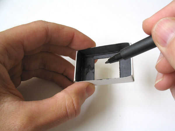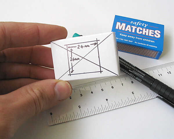 Eliminar la parte interior de la caja de cerillas, la bandeja del partido. Marcar un cuadrado de 24mm exactamente en el centro de la bandeja del partido. Alternativamente, si usted quiere estándar fotos rectangular formato (algunos laboratorios fotográficos éstos encontrarán más fácil de imprimir) marcan un rectángulo de 36 x 24 mm. Cuidadosamente corte la forma del marco con un cuchillo afilado, manteniendo los bordes tan limpio como sea posible, o si lo prefiere, que sea desordenado, es usted! Los bordes ásperos y fibras tarjeta aparecerán alrededor de los bordes de cada foto.