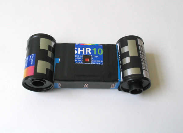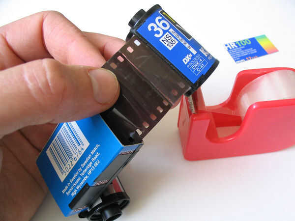 Con alguna cinta adhesiva clara, empalmar los extremos de la película junto como perfectamente posible. Trate de asegurarse de que los bordes se alinean juntos por lo que la película puede pasar fácilmente en el recipiente vacío. Ambos lados de la cinta, y asegúrese de que la articulación esté segura.