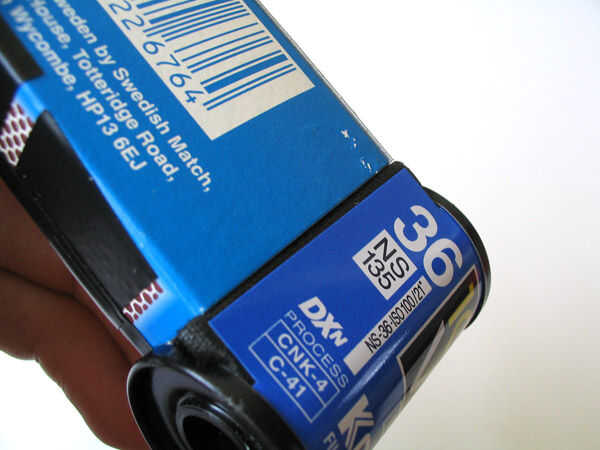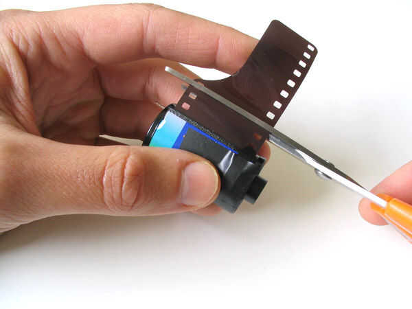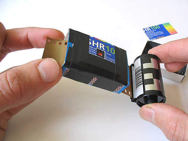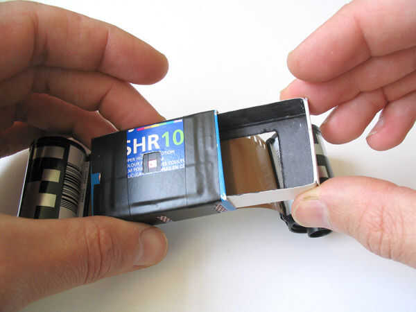 Saque un poco más de película y la película a través de la caja de cerillas del hilo de rosca. Asegúrese de que la emulsión lado (sin brillo) es hacia el agujero de alfiler