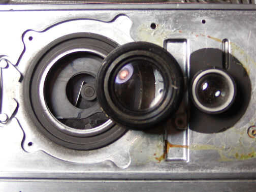 a un lado (esto se hará en la tapa del objetivo). Cubrir la ranura semicircular pequeña al lado de la lente con un pedazo de cinta aislante, para evitar fugas de luz.