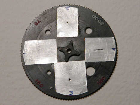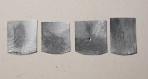 de una lata de soda). Hacer 4 pequeños cuadrados (aproximadamente 1/2 por 3/4 pulgada) en el centro de cada pieza, perfore un pequeño agujero de diferentes tamaños. Hice 3 agujeros y uno con una pequeña hendidura. Para perforar los orificios, utilice una chincheta, clavo, etc., y he utilizado un cuchillo para cortar la ranura. Arena de las rebabas de la parte posterior de los agujeros de alfiler y difamar a un lado con pintura o con un rotulador. Pegamento las piezas de metal a la esfera, centrado de los agujeros de alfiler en cada una de 4 agujeros. Escriba un número pequeño en la parte inferior de cada hoja de metal, para distinguir cada agujero de alfiler. Tenga en cuenta que, al volver a montar, el número que aparece se refiere al agujero de alfiler en el extremo opuesto de la esfera.