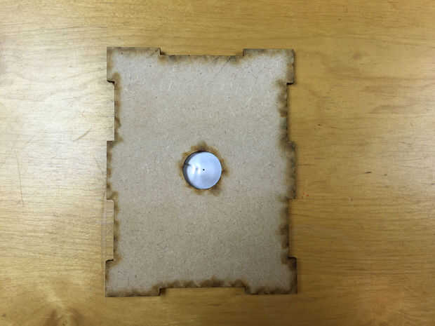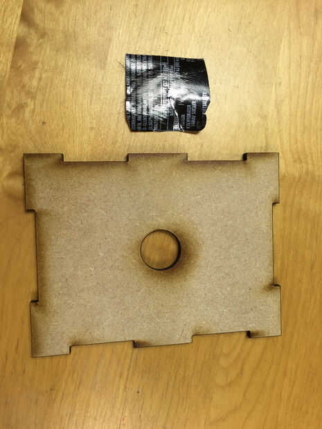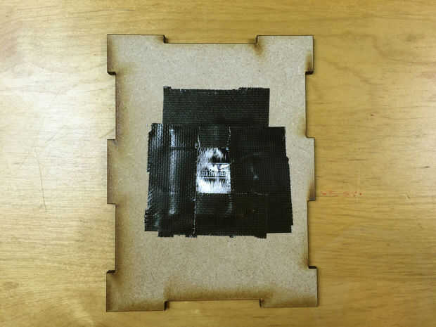 Encontrar la pieza central de la caja externa. Fije la placa de aluminio con piezas de cinta negra. Control que se centra el agujero de alfiler.