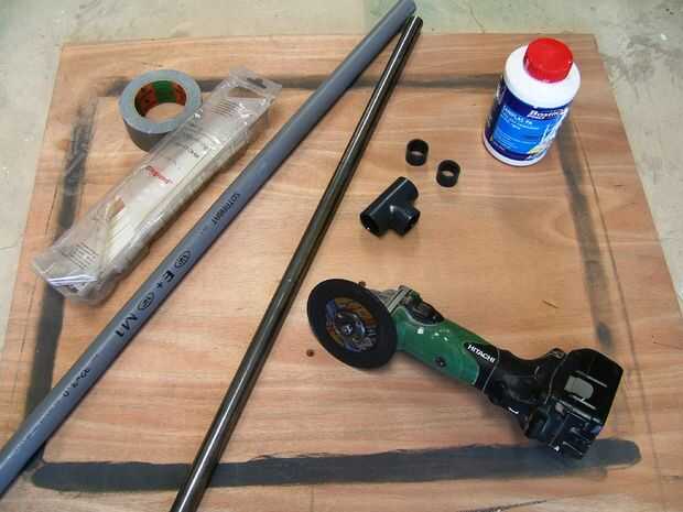 Todo lo que necesitas: un trozo de pvc, un trozo de tubo metálico (más pequeño), cemento para pvc, cierres y powertape.