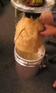 Ésta es una fuente de la burbuja que hice para mi gato después de que descubrí que le encantaba jugar y agua potable móviles. Las burbujas del agua hacia arriba desde la parte inferior del recipiente mediante una bomba de aire de acuario. El colador