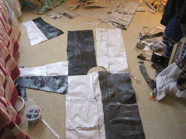 Pin el modelo de periódico en las hojas de plástico. Recorto. Cortar un círculo con el diamiter de 7 pulgadas por la mitad. Centro en la parte superior y corte para hacer el collar. Corte frente a la mitad. Unir los hombros de un brazo abierto y que el otro. Ahora la parte difícil. doblar y coser los brazos y lados de una fallar sola vez. Tapa interior (ahora declarada dentro en) ahora hay una costura donde los brazos y los laterales están juntos.