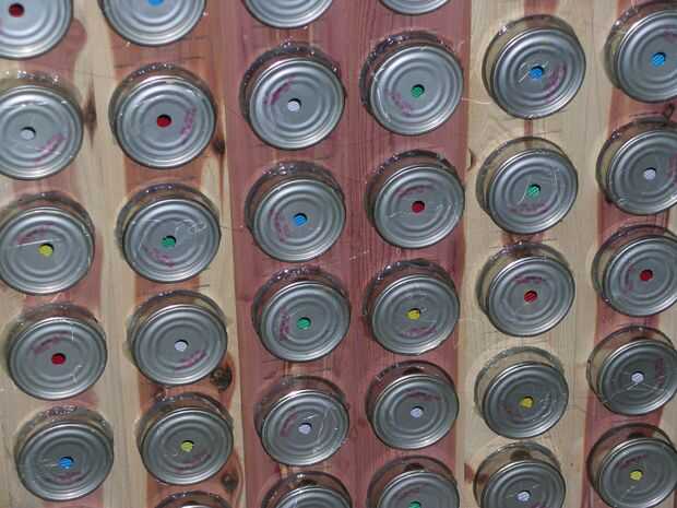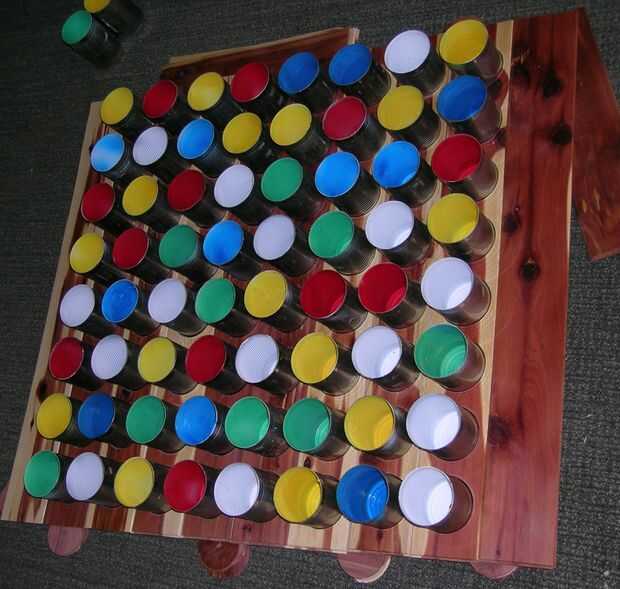 Quería que los extremos de las latas que incluso y la base para que le sobresalgan por la parte posterior del panel por sólo 1". Utilizando pilas del orificio de piezas que fueron perforados fuera de las tablas con el fin de nivelar el panel completo boca abajo para que cada uno puede sobresalir por 1" a través de la espalda. Usando la pistola de pegamento caliente, se colocó una gota del pegamento alrededor de la base de cada uno puede asegurar al panel.