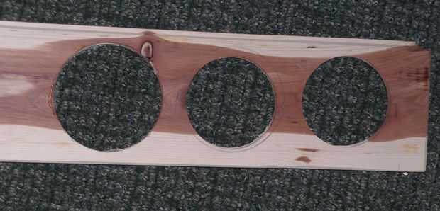 El perro alimentos puede diámetro es 3" y encontrar una sierra del agujero este tamaño fue fácil. Medí la línea central de las tablas y luego la distancia entre los centros de dos tablas al lado del otro.
