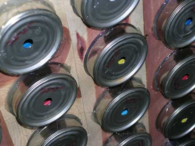 A continuación preparar las latas. El interior de las latas eran de un color gris que absorbe la luz de lo LED, con el fin de obtener más de la luz a la huelga las lentes que rebote, esto fue lograda por el interior de las latas de pintura con pintura de marcador.