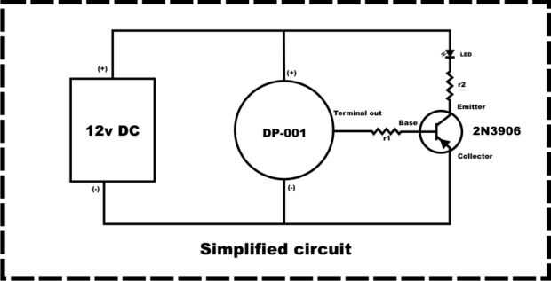 No necesitamos corriente fluyendo a través de la terminal de salida de la DP-001 y la base del transistor 2N3906, sólo necesitamos tener un interruptor de lógica entre "alta" y "baja", para reducir la corriente a través de la base del transitor añadir una resistencia de ohmios 1 k (r1) en la salida de la terminal DP-001 y la base del transistor 2N3906.