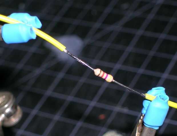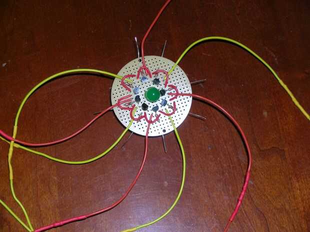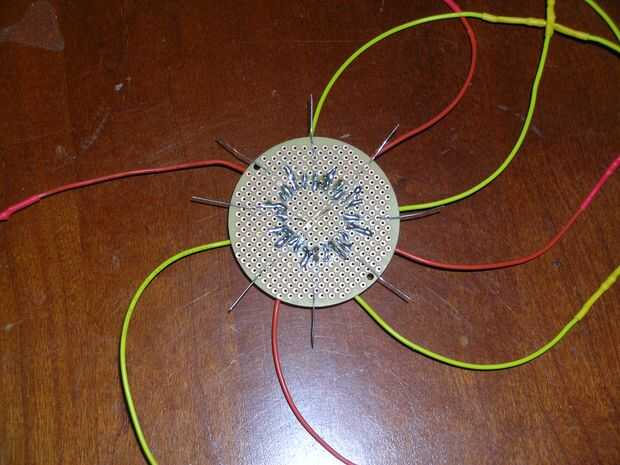 Las fotos siguientes muestran la placa "flor", observe las líneas amarillas y roja, cada uno tiene un resistor limitador actual (r2) en línea y con encogimiento del calor.