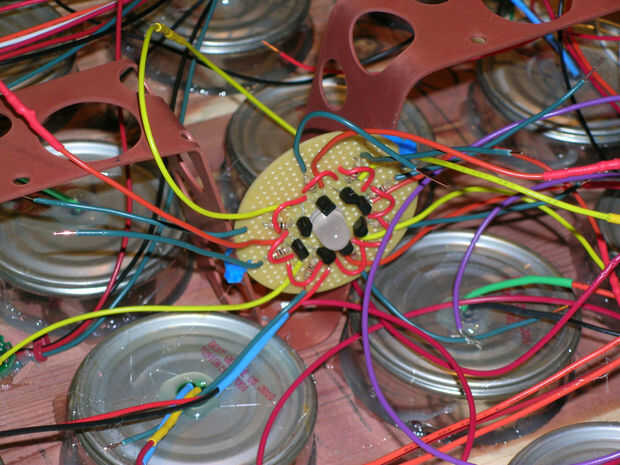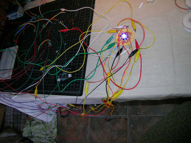 La prueba de circuito trabajada; la siguiente parte era pegamento caliente todos los LEDs en sus latas, manteniendo una ruta ordenada de los cables. La flor de circuito fue atada a la parte posterior del panel de matriz a un soporte de metal con en la parte posterior de los lazos del cierre relámpago de panel.