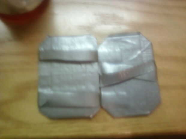 Cosas que necesitará: al menos 2 rollos de distinto color del conducto cinta y un cuchillo del exacto y tabla de cortar. (o tijeras)Paso 1: Corte 8inch dos pedazos de cinta adhesiva para conductos,Paso 2: Girar ellos lado pegajoso hacia arriba.Paso 3