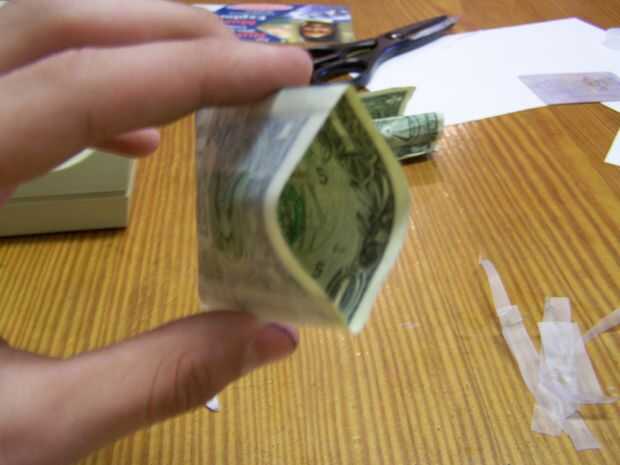 Doble otro billete de un dólar (#3) por la mitad para chuletas cara de Washington en la mitad de arriba a abajo. Inserte una tarjeta de crédito en la cuenta. Ahora, doblar los bordes alrededor de la tarjeta y la cinta hacia abajo para que no se deshagan. Ahora debe ser un bolsillo. Tenga cuidado de no hacer los pliegues demasiado apretado, o una tarjeta no se deslizarán en ella fácilmente y puede romperse.