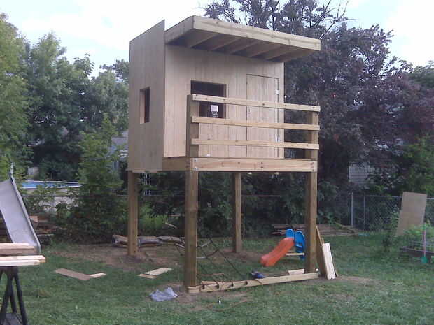 solía 4'x 8' hojas del revestimiento de cubierta de la casa club. 8' altura cubre las vigas en la parte inferior y se extiende para ocultar lo que será la caja para el jardín en la azotea. Esto no fue planeado. Es mejor ser afortunado que bueno a veces. Una vez que el revestimiento fue asegurado usé un recorte en mi router para cortar las ventanas y puerta. El panel se quitó de la puerta se convirtió en la misma puerta. Es con un kit de hardware screendoor básica que incluye 2 bisagras, manija y primavera junto con todos los tornillos necesitados.