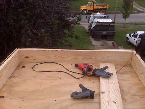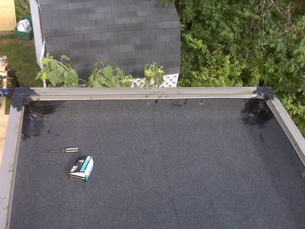 La parte inferior de la caja de jardín es el revestimiento del techo. Simplemente puse un marco rectangular en la parte superior. El knothole en la esquina izquierda en la imagen siguiente es aproximadamente donde el desagüe. Usé rollo cemento para techos y la azotea para tratar de la caja. Resulta que 1 galón de techo de cemento no ir muy lejos. Obtener 2. En la parte inferior de la caja forrado el punto ángulo con tiras largas de madera para crear un ángulo de 45 º en vez del ángulo 90deg encuentro los lados de la parte inferior. Tuve que hacerlo porque el rollo de material para techos no puede hacer una curva de este sharp sin agrietarse. Escribir 3 cursos del rollo del material para techos, teniendo en cuenta de donde estaba el punto bajo. Un mejor material habría sido cubierta de caucho, EPDM, pero tuve que usar lo que he podido conseguir. La superficie de grava significa que no hay un buen sellado entre el material de cubierta y el desagüe.