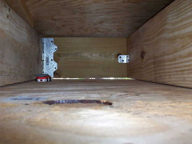 Usé un pedazo barato de alfombras al aire libre plástico verde para alinear el suelo y pequeños juguetes de caer a través de los espacios entre tableros de cubierta. Además puede ser hosed hacia fuera.