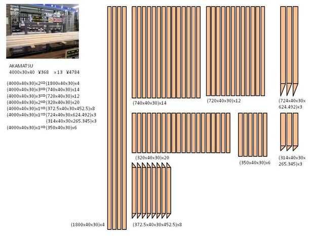 Seguramente muchas maderas son útiles, pero pino rojo o cedro japonés es ideal para eso. Por ejemplo, en Kahma Inicio Centro de Japana (http://www.kahma.co.jp), un Redpine madera precio (4000 x 40 x 30) es \368 que es $3,6, es muy rentable. Si usas el Redpine cuyo tamaño is(4000x40x30) de la madera, el costo total de la madera es \4784 que es de $47,8.