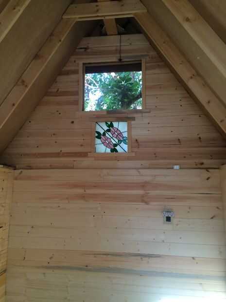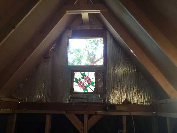 El techo fue diseñado para ser ligero, razón por la cual Pino 1 x 4 pulgadas fue utilizado en combinación con luan atornillada con tornillos de más de 150 para una agradable mirada interior ligero cubierto con envoltura de plástico de vivienda comercial, aislamiento de burbuja de aluminio y una lona barata. Otro ATA resistente tejido lona (asegurado en ganchos de ojo pesado) fue empleado en el diseño por lo que el techo de luan de peso ligero permanece asegurado a la estructura durante los vientos severos, algo así como una vela en alta mar. Video de YouTube condensa a once meses de trabajo en un videoclip de dos minutos de instrucción.