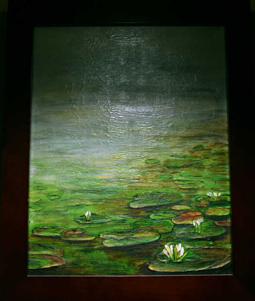 ¿Supongo que esto podría ser en la semana verde o azul? Este pintado con acrílicos y Texturizador que he añadido algunas de las pinturas para dar la pintura cierta profundidad. Este cuadro se basa en mi patio trasero de mi casa de ensueño que nos va a dejar pronto y este será mi recuerdo de él. Esta pintura no es mi estilo tampoco, es como la pintura de "Caos organizado", mantuve mi cepillo más libre y trató de suprimir el freak control en mí... LOL. Suelto lo suficiente como para hacerla más de una impresión pero todavía sé lo que el sujeto es en este tiempo. Espero que les guste.