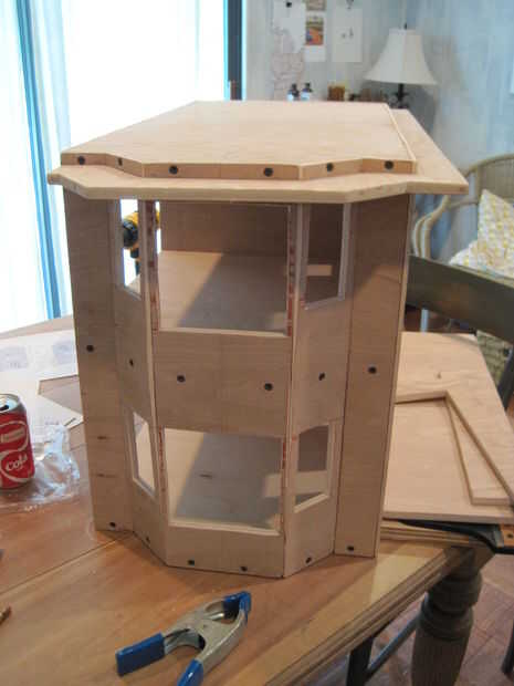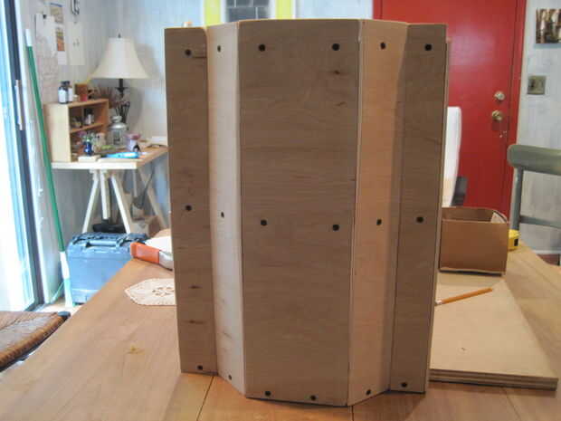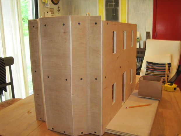 En este punto ninguna de las secciones de pared se pegan. Las plantas se sujetan con tornillos para madera que previamente perforados y contador hundido. Los cortes angulados para obtener todo el ventanal paredes panel alinear correctamente fue difícil, pero yo seguí presionando.
