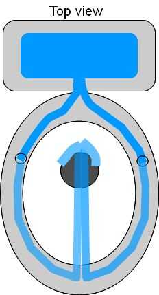 Se puede ver la causa del problema en la imagen adjunta. Cuando usted descarga, agua de los jets del tanque hacia fuera a lo largo de la parte inferior de la llanta a muy alta presión de ambos lados. Cuando chocan las dos corrientes, cambian de dirección y el arco a través del aire a la parte trasera del inodoro, donde pierden su velocidad con mucha violencia. Esto salpica el contenido de la taza de aseo en el aire. Además de ser un lío para limpiar, este flujo mal dirigido hace muy poco para mantener el recipiente limpio y eso es claramente insalubres, especialmente si su sistema digestivo está un poco en la parte líquida (mis compañeros vegetarianos son probablemente asintiendo con la cabeza a sabiendas).
