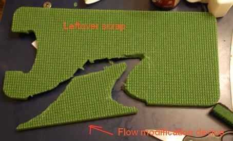 Mi dispositivo de modificación de flujo se corta de cojín del arrodillamiento del jardinero. Es espuma de célula cerrada, rígida y cuesta alrededor de $5 en una ferretería. Apenas sucede ser el grosor perfecto para caber cómodamente dentro del borde del tazón de fuente. Nota: el borde del tazón de fuente es más ancho en los lados que en la parte delantera.