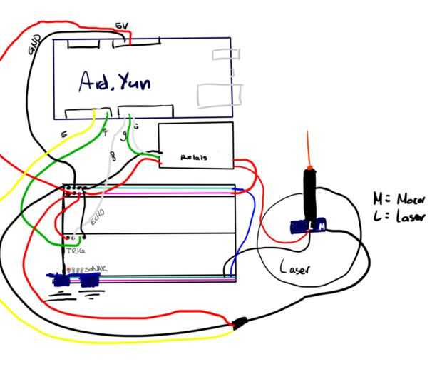 Van het plus draadje de láser es vastgemaakt op het relais en de min op het experimenteerboard. Nu kun je dobladillo uit en aan doen zonder het knopje en te moeten drukken. Verder es het relais aangesloten aan de Arduino = equipo.