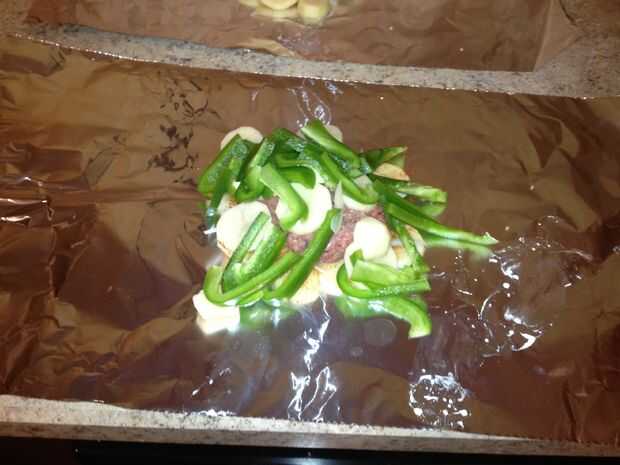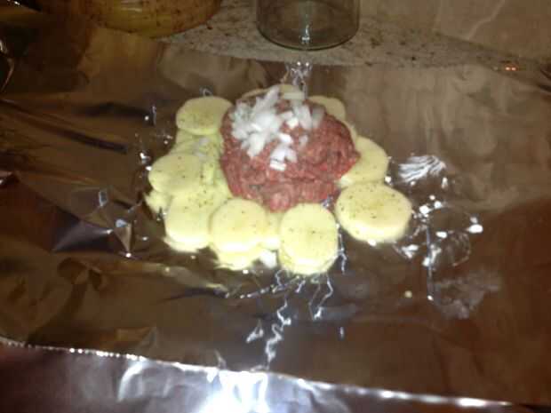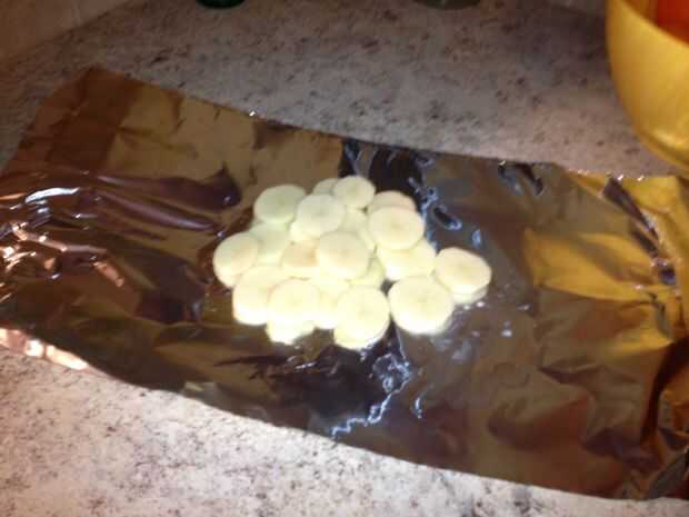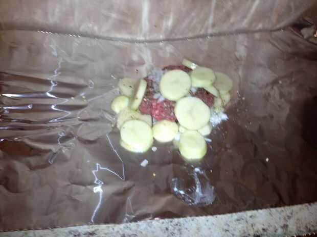 Con su hoja de aluminio sobre la superficie de trabajo, colocar la mitad de sus papas cerca del centro de la hoja siendo cuidadoso de mantenerse alejado de los bordes.