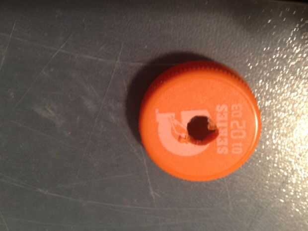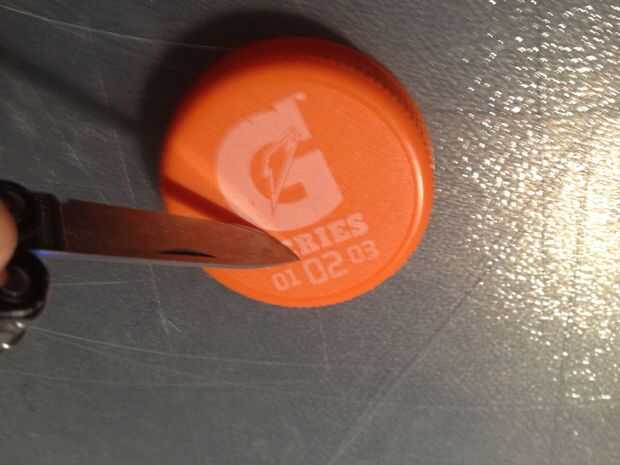 Tomar tus deportes tomar la tapa y sacar su cuchillo de la manía. Corte un agujero en el centro ligeramente más grande que la pluma hasta que deslice sobre el lápiz sin todavía ser ajustado.