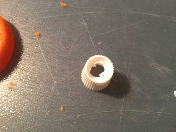 Tomar su pasta tapa o labio bálsamo tapa y tallar un agujero en el centro suficientemente grande para que la pluma para adaptarse cómodamente a través de. Este paso es muy similar a la de los últimos pasos.