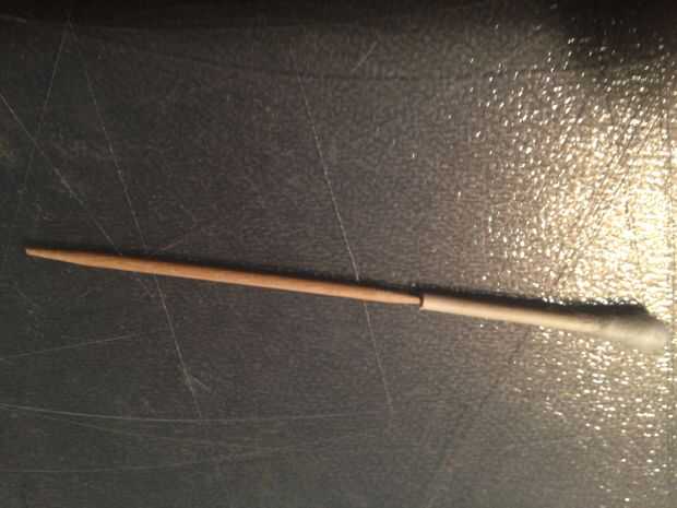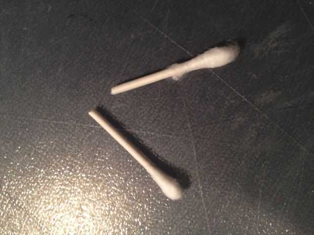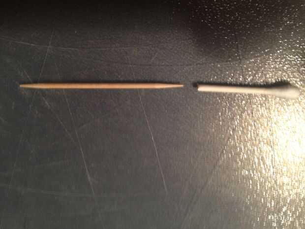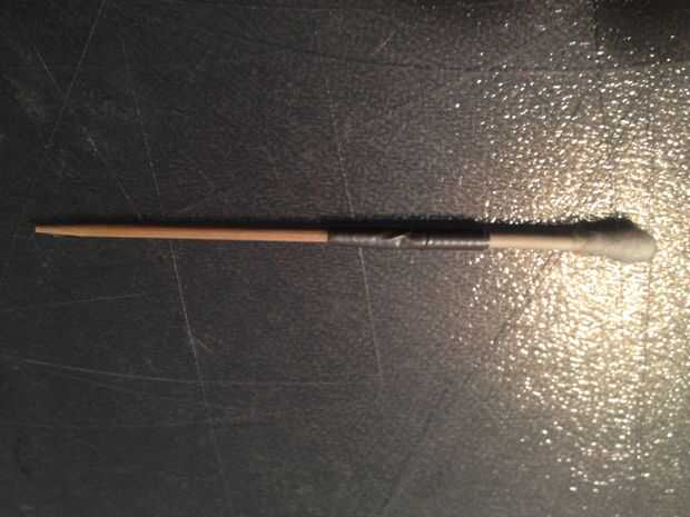 Tiempo para construir su munición de cerbatana. Tome su q-Tip y cortar por la mitad. Tomar una de las mitades y empujar el palillo de dientes en el extremo duro de la esponja media. Entonces firmemente envolver en cinta del pato!