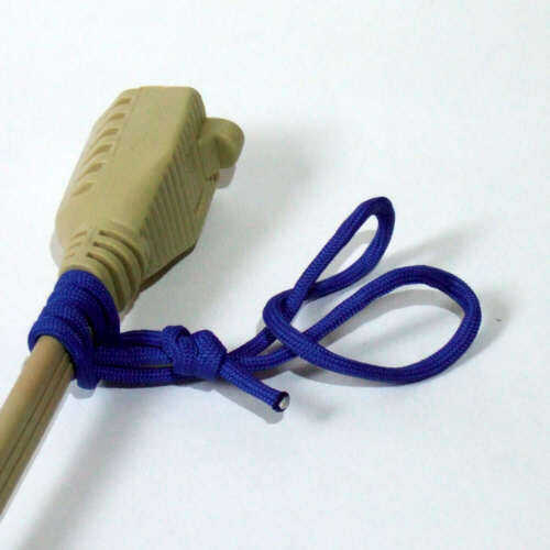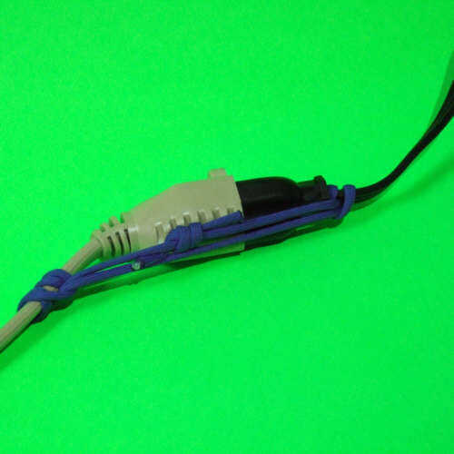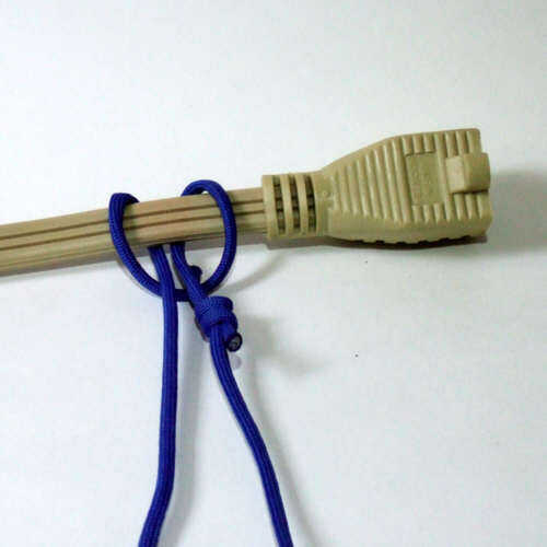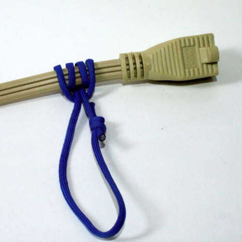 Hacer un lazo doble en el extremo opuesto el Prusik. Deslice este en el enchufe de la herramienta y apriete. Conecte los cables juntos. Luego deslice el Prusik hasta que el cable de extensión tiene una leve curva y su cable está bloqueado. Para desbloquear, afloje la mitad de lo Prusik presionando donde sale el lazo y luego deslícelo hacia el zócalo. Esto le dará suficiente holgura para desconectar el enchufe de la herramienta y retire el bucle alrededor de él.