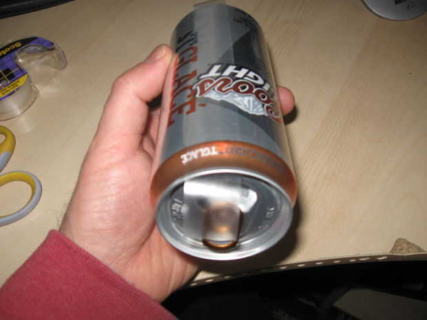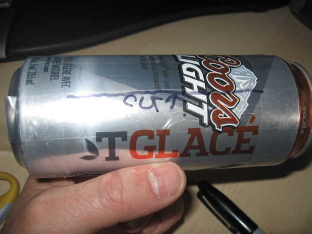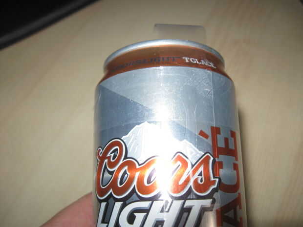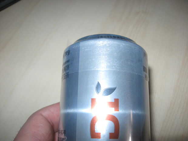 La marca de una franja de ancho de cinta en el lado opuesto de la lata de la abertura también va de arriba a abajo.