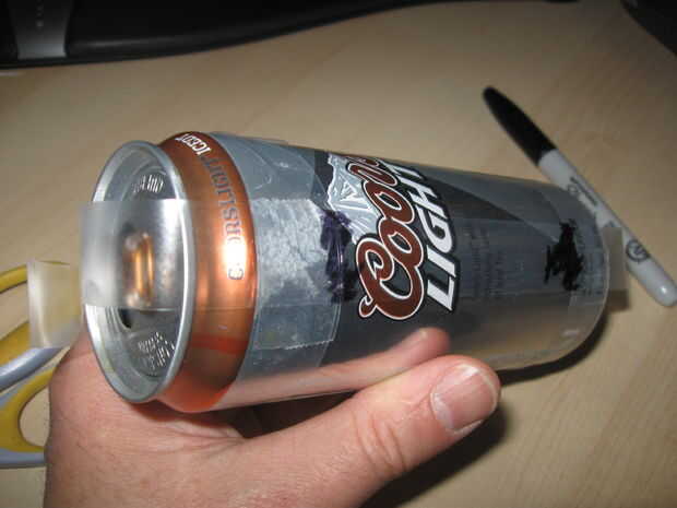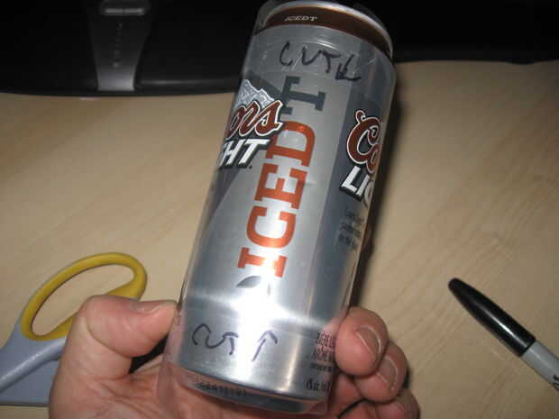 La marca de una franja de ancho de cinta alrededor de la lata de la borde biselado superior a una inferior.