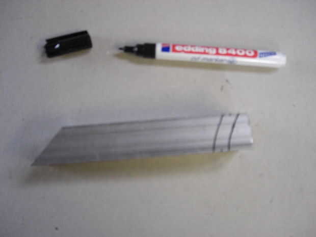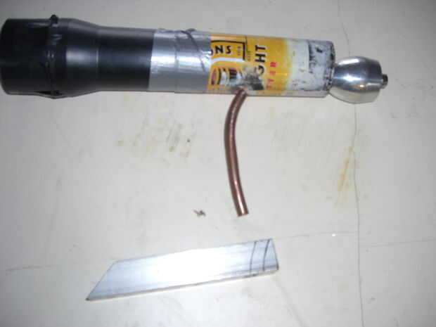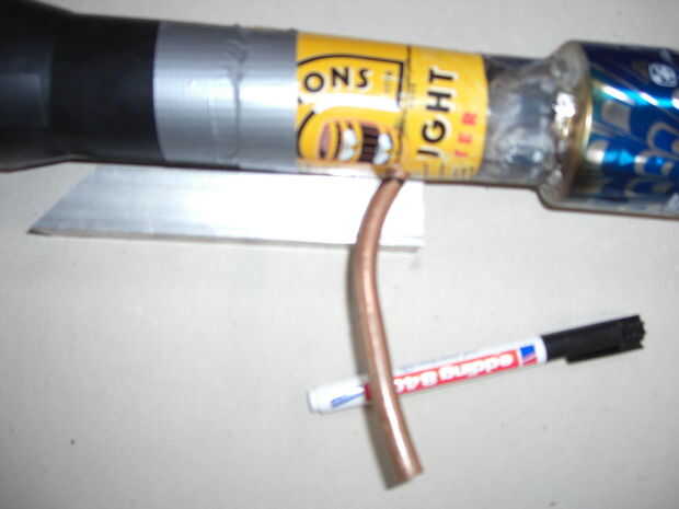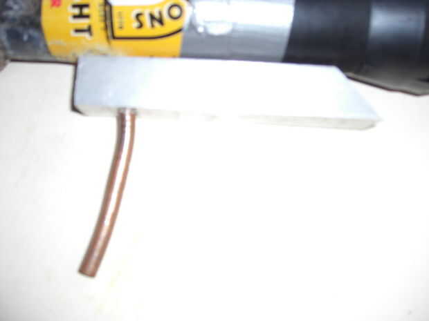 El tubo de metal de hoja no es lo suficientemente robusto para garantizar el inyector de combustible a ventilador canalizado con usé un pedazo de la sección de caja de aluminio tomé "prestado" de mi hermano. Puede utilizar cualquier material de sección cuadrada resistente, madera incluso puede ser suficiente. Alinee su inyector de combustible en la entrada a la cámara de combustión y luego mienten el ontop de tubo de cobre de la sección de caja. luego dibujar sobre ella en el esquema de la ruta de los tubos. Mida y marque el centro del camino y usar una escuadra para traducir esa línea en su cara superior de la cara y parte inferior respectivamente. Medida del centro de la longitud de las secciones y marque de nuevo utilizando la escuadra. Ya que mi tubo está doblado no tenía un agujero hasta los caja sección algo 2 seoeratly perforado los agujeros para que se deslice a través.