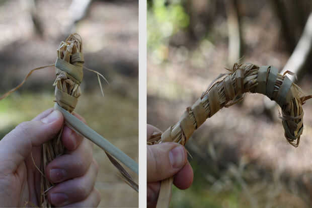 Para comenzar su bobina, agarra un puñado de hierba y dóblelo para formar un lazo. El atascamiento de la totora es roscado a través del lazo y envuelto alrededor del césped, vinculante en una bobina sólida. Las envolturas de enlace pueden ser tan juntas como quieras, pero recuerda que cuanto más cerca juntos son cuanto más tiempo que se tarda, y más material tendrá que utilizar. Porque estamos tratando de ir rápido, un poco de espacio es aceptable. Dejé sobre una media pulgada de espacio entre cada abrigo.