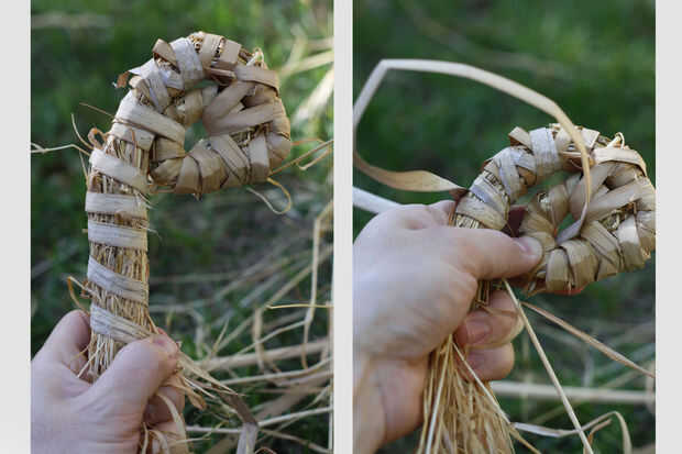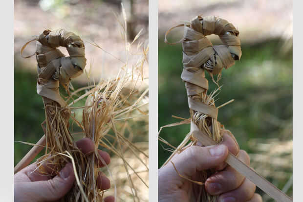 Cuando note que están quedando sin enlace, tome el extremo de su hoja de totora y recostarla en su bobina, paralela a las fibras de hierba. Luego simplemente agarrar una nueva pieza de Unión y envuélvalo alrededor del extremo de la pieza anterior. Si sus bobinas están bien agrupadas, las bobinas llevará a cabo el enlace nuevo en su lugar. Incluso puede envolver el enlace una vez alrededor de sí mismo para la fuerza agregada.