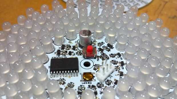 Ahora que ya tienes los componentes pequeños en su lugar, añadir en los dos interruptores. Poner la grande de las almohadillas etiquetada modo, ya que es el uno podría utilizar más. La forma del interruptor hace un poco más difícil soldar en su lugar. Encontré la clave para ser soldar un contacto en su lugar, con el interruptor centrado en las almohadillas. Si calienta las otras pastillas y usa buen flujo, la soldadura se mecha en debajo bastante fácilmente. El otro interruptor va en los botones de Reset. Más ha expuesto a contactos, por lo que es más fácil soldar hacia abajo. Agregar en la tapa grande de 220 uFd, el microcontrolador, la pequeña tapa en la parte posterior enfrente el microcontrolador y el conector de 6 pines. Nota: la imagen aquí muestra los LEDs instalados. Si usted está siguiendo a lo largo de mientras uno de ellos, no hay todavía!
