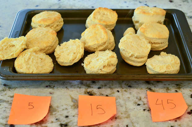 Como puede ver en las fotos, la masa que se amasa sólo 5 x no subir absolutamente tanto como las otras galletas. Lo bueno de rosa y colapsado. La masa que fue amasada x 15 y x 45 era más "estructuralmente sonido" (como las galletas que hemos visto antes con menos mantequilla o leche).