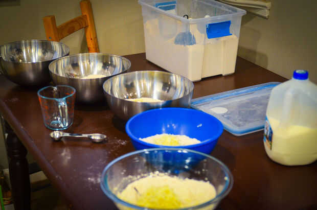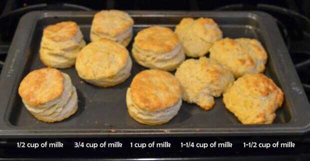 Para averiguarlo, he hecho cinco tandas de galletas que eran idénticos excepto por la cantidad de leche utilizada. Cada lote utiliza dos tazas de harina y normalmente hace 8 galletas, pero sólo cociné dos bizcochos de cada lote para que pudiera estar seguro de que las condiciones de cocción eran exactamente el mismo para todas las galletas.