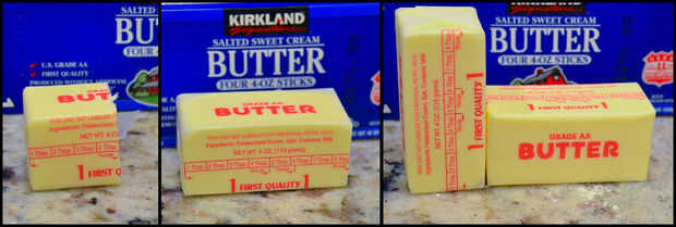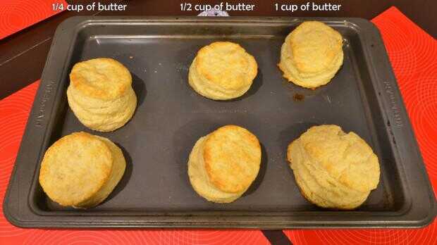 Para averiguar, hice tres tandas de galletas que eran idénticos excepto por la cantidad de grasa utilizada (en este caso, mantequilla). Cada lote utiliza dos tazas de harina y normalmente hace 8 galletas, pero sólo cociné dos bizcochos de cada lote para que pudiera estar seguro de que las condiciones de cocción eran exactamente el mismo para todas las galletas.