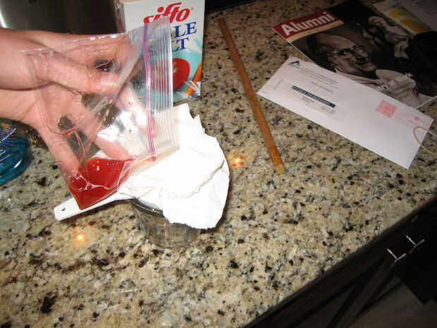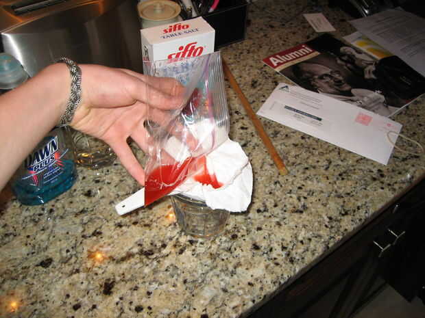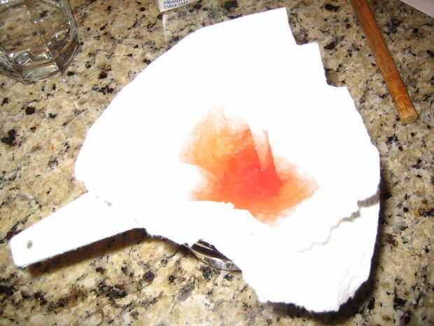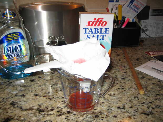 Vierta esta mezcla de líquido de la extracción y el jugo en el embudo con el paño de queso y tomar líquido en un recipiente por debajo.
