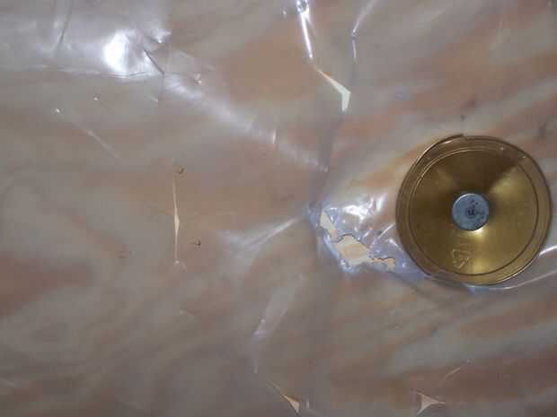 antes de empezar a realizar los orificios que permiten el escape del aire tenemos que atornillar una tapa de plástico (de una tina de mantequilla o algo) al centro, se creará la bolsa de aire. siguiente corte agujeros como cerca de la tapa como sea posible tendrá que probarla para saber cuánto los agujeros necesitan ser