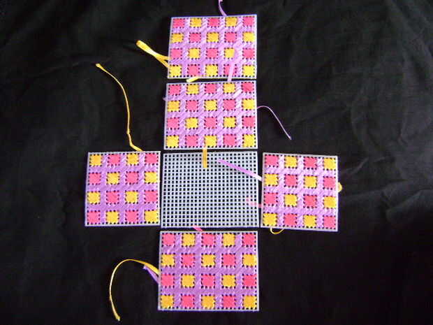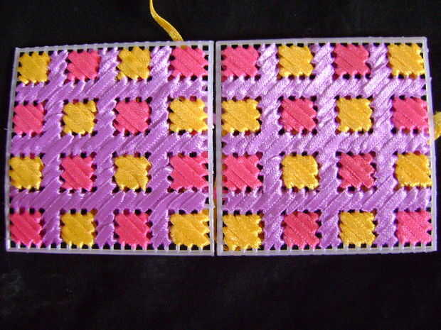 Pieza dos, trabajo con la siguiente primera cinta amarilla todos los pasos de rosa, mencionado anteriormente, luego con cinta rosa siguiendo los pasos de amarillo mencionado. Trabajar con violeta por fin.